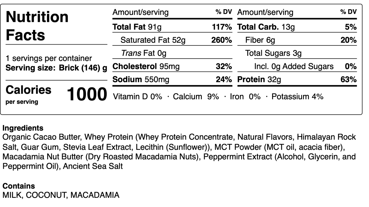 Protein, carbohydrates, fat, and alcohol are the food components that contribute calories to the foods that you eat. They, however, do not contribute to calories equally. Protein and carbohydrate contribute significantly fewer calories per gram than fat or alcohol. Common conversion factors, referred to as the 4-4-9 formula, are most often used by manufacturers to calculate calorie values for their products. More specific conversion factors based on food type, called Atwater factors, are commonly used by the USDA database to calculate calorie values for foods. These more accuracte calculations rarely equal 4, 4, and 9 exactly. Depending on the food, it may be closer to 3.4-4.27 and 8.37-9.2 respectively. Combine that with the fact that many of our suppliers round the nutrition statements on our ingredients slightly and it becomes increasingly more difficult to be exact. Short of placing a Keto Brick in a bomb calorimeter and acurately measuring each one scientifically in a certified lab, we are doing everything we can to get as close to the actual and accurate macronutrient numbers and calories listed on the Keto Brick packaging. As is true with all food types, these slight inaccuracies average out over time as long as you are consistent with your tracking methods and consumption.